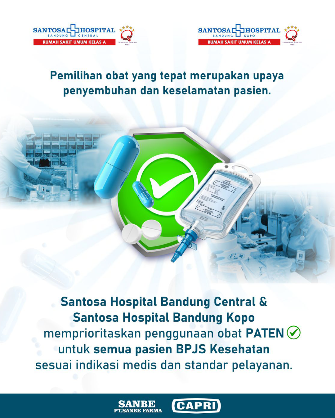 Santosa Hospital Bandung Central dan Santosa Hospital Bandung Kopo memprioritaskan penggunaan obat Paten untuk semua pasien BPJS Kesehatan sesuai indikasi medis dan standar pelayanan.