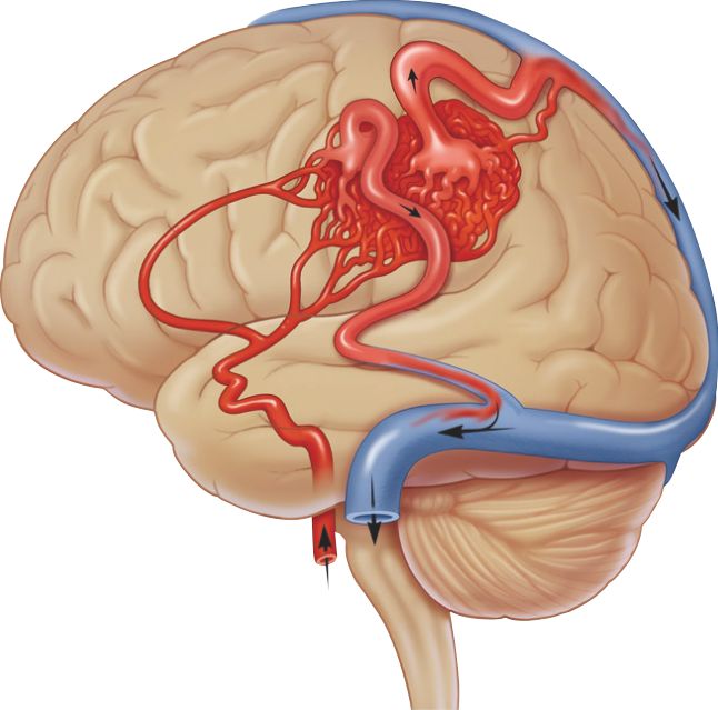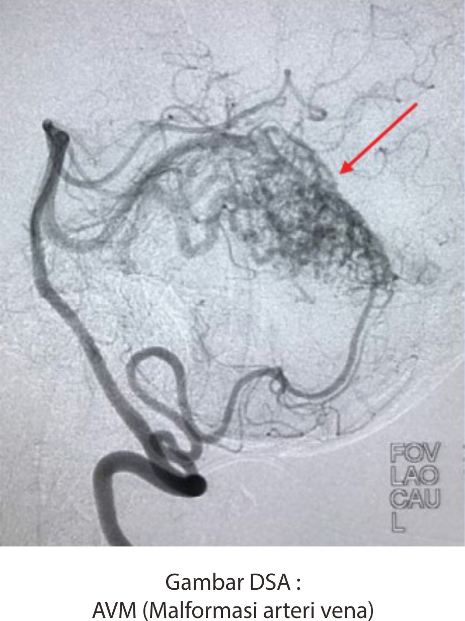 - Pasien dengan perdarahan di otak dan diduga disebabkan adanya AVM (malformasi pembuluh darah) yang pecah, seringkali usia muda, lokasi perdarahan di kortikal, tidak ada riwayat darah tinggi, perdarahan berulang di daerah yang sama.